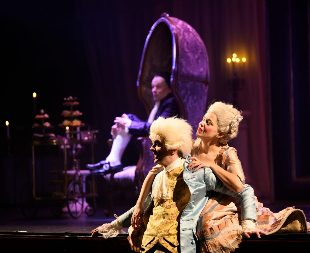 Foto (David Delaplace/Théâtre Marigny): „Wolferl“ mit Constanze, Salieri im Hintergrund