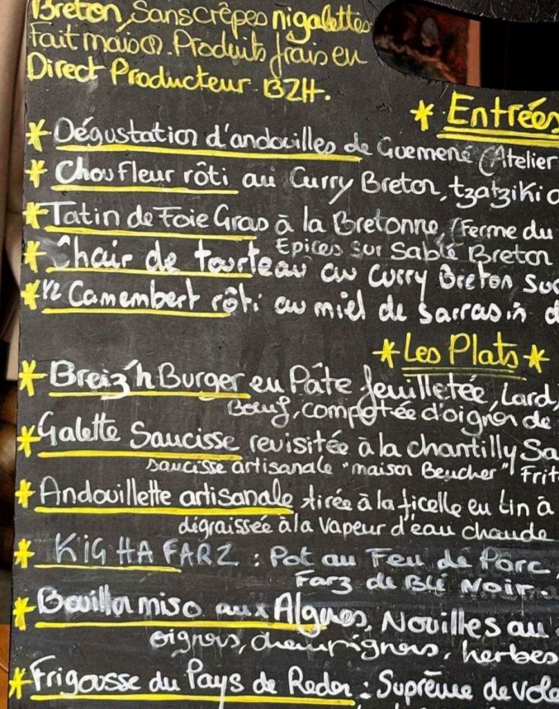 Bereits die Apéro-Karte entführt mit Kir breton und Breizh Spritz an die Atlantik-Küste. Der Patron kommt aus Saint Malo und legt nicht zuletzt deshalb Wert auf Zutaten aus der Bretagne. Klassiker der bretonischen Küche, wie Galettes und Crêpes, spielen hier allerdings nur eine Nebenrolle, dafür steht viel Innovatives auf der Speisekarte.