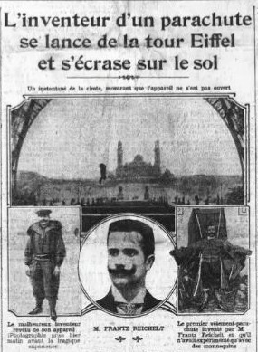 Am 4. Februar 1912 wollte Franz Reichelt der Öffentlichkeit eine spektakuläre Erfindung präsentieren: einen Fallschirm-Mantel, der seinen Traum vom Fliegen wahrmachen sollte. Er sprang in etwa 60 Metern Höhe von einer Balustrade des Eiffelturms, um seinen neuartigen Anzug vorzuführen.
