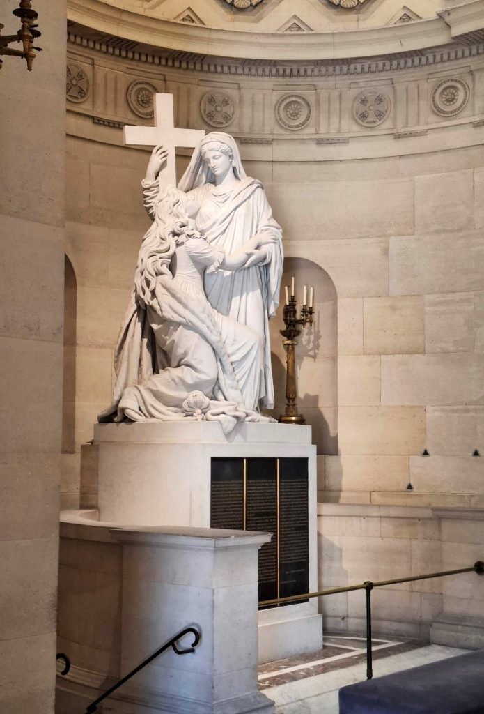 Rechts und links vom Altar ziehen zwei große, weiße Marmorstatuen die Aufmerksamkeit der BesucherInnen auf sich. Auf der linken Seite klammert sich eine Hilfe suchende Marie Antoinette (Bild) an ihre Religion (in Gestalt einer Frau). Rechts ist der König, gestützt von einem Engel, zu sehen. Die beiden Werke wurden von der ältesten Tochter des Paares, Marie-Thérèse Charlotte, gestiftet. Sie ließ auch letzte Botschaften ihrer Eltern in die Sockel der Statuen eingravieren.