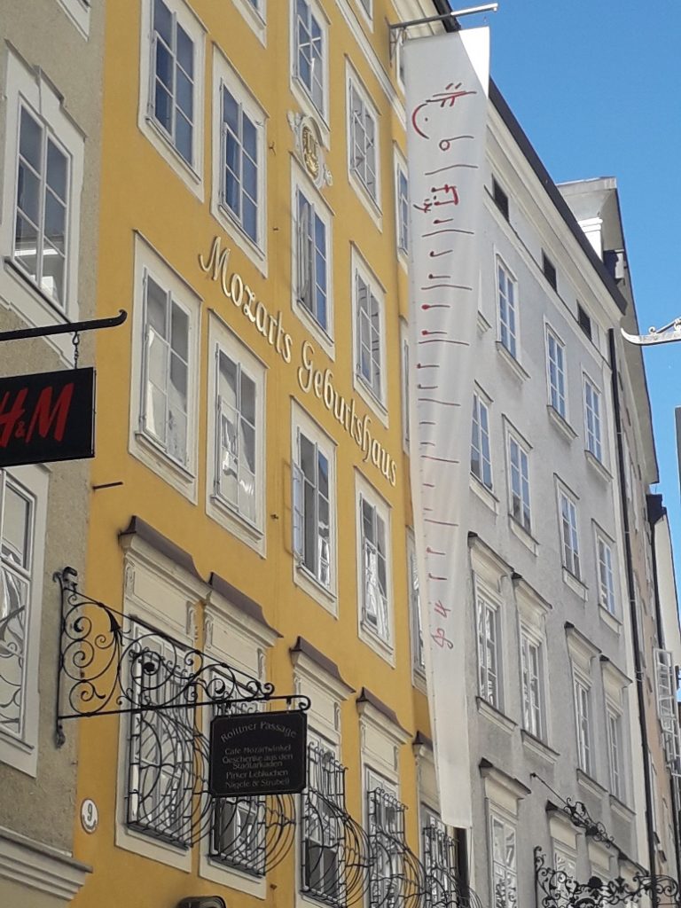 Die rot leuchtenden Noten auf der Fahne sind eine Projektion des Original-Autographs des Komponisten, das im Besitz der Internationalen Stiftung Mozarteum ist. Je nach Wind und Wetter zaubern die Noten in der Handschrift Wolfgang Amadeus Mozarts changierende Akzente an sein Geburtshaus. Die Fahne unterhält nicht nur die üblicherweise vor dem Gebäude stehenden Touristengruppen. W.A. Mozart wird so "ganz ungezwungen zu einem lebendigen Teil des Alltags der Stadt", so Andreas Feldinger. "Es ist ein bewegtes Gesamtkunstwerk, das ein längeres Betrachten und Verweilen einfordert." Der Salzburger Künstler hat mit seiner Idee auch ein paar Takte Frankreich an die Fassade des Gebäudes in der Getreidegasse Nummer 9 gezaubert.